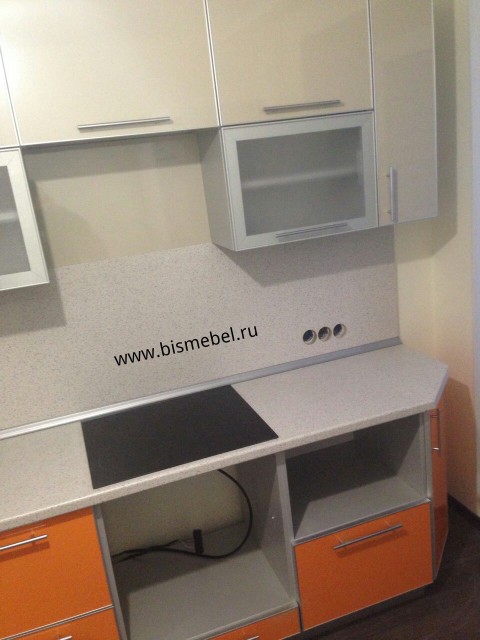 Стеновая панель пластиковая в тон столешницы.