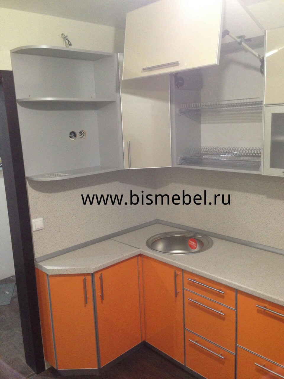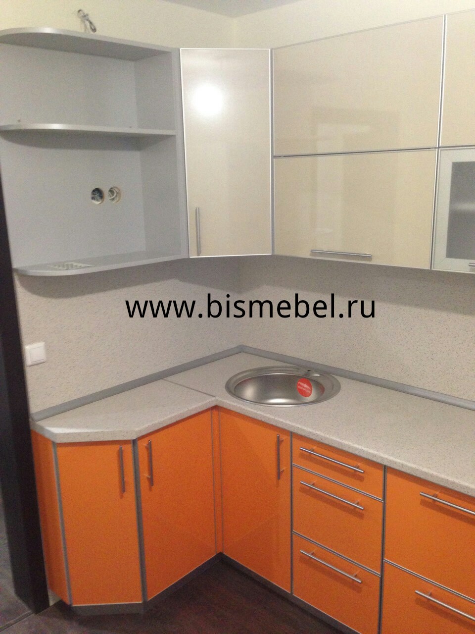 Кухонный гарнитур с фасадами МДФ в пластике в алюминиевом профиле. Фасады стекло. Открытые полки с боку. Подъемные механизмы фирмы Blum.